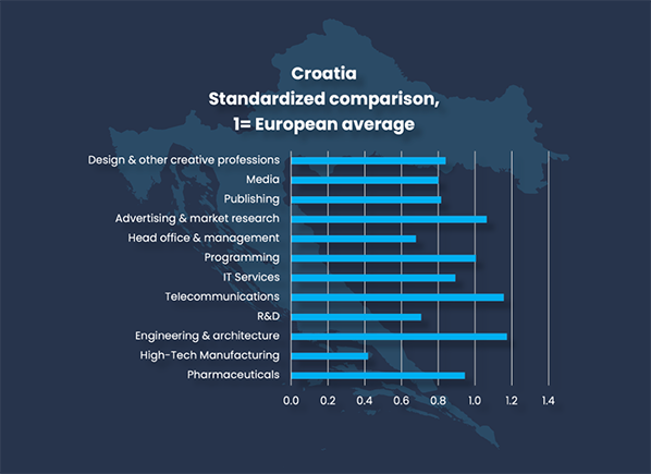 Croatia has particular relative strengths in telecommunications, where 10 550 are employed. The country has recently developed a relatively strong engineering & architecture sector, with 33 300 employees. In the Zagreb region as many as 18.9 percent of the adults are employed in brain business jobs, this is the 8th highest share in a regional comparison, with all European regions that data exists for. The Jadranska Hrvatska region also has a relatively high share, 4.9 percent.
