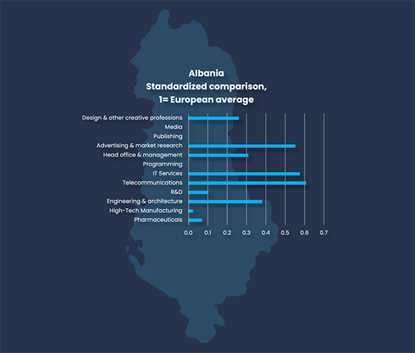 In Albania, 1.7 percent of the working age adults are employed in brain business jobs during 2025. This is a term for employment in knowledge-intensive firms in tech, information and communications technology, advanced services, and creative professions. While the lowest rate in all Europe, the share of knowledge intensive workers has increased significantly from 1.4 percent the year before. A significant growth of knowledge intensive jobs is occurring in Albania, signifying catch-up. Albania has particular relative strengths in telecommunications, where 4 300 are employed. The country has also recently developed a relatively strong IT services sector, with 2 900 employees.