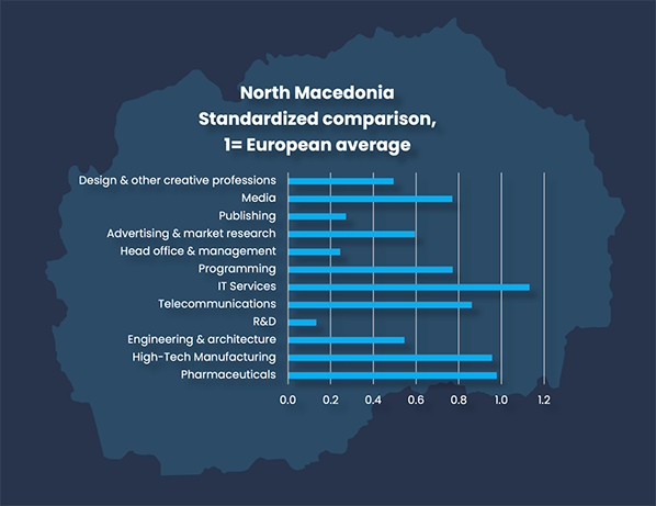 North Macedonia performs somewhat better, with 4.7 percent of the adults employed in highly knowledge intensive jobs. This region is also catching up significantly, with share of adults in brain business jobs climbing from 4.1 percent a year ago. There is strong opportunity for further growth, as North Macedonia underperforms in terms of share of brain business jobs amongst the adults, and the share of adults who are engineers and scientists. There is a talent pool with competitive wages, to fill in more knowledge-intensive jobs, in North Macedonia. North Macedonia has particular relative strengths in IT services, where 3 050 are employed. The country has also recently developed a relatively strong pharmaceutical sector, with 2 650 employees.