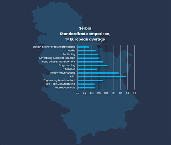 In Serbia, 5.4 percent of the adults work in brain business jobs, up from 5.2 the year before. This means that Serbia is nearly as knowledge intensive as Spain and Italy, just lagging behind due to low share of adults employed in design and other creative professions. With integration in European service trade, and focus on competitive taxation and regulation, Serbia has significant potential for growth. The country has a relatively high share of adults who are engineers and scientists. In relation to the share of knowledge intensive jobs Serbia has a surplus of experts, which signals potential for further growth.