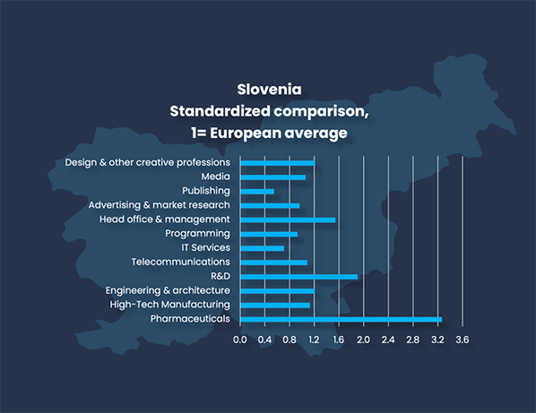 Attractive taxation and business policy allow for more jobs than expert density alone would predict. Slovenia has particular relative strengths in pharmaceuticals, where 12 300 are employed. The country has also recently developed a relatively strong research & development sector, with 4 950 employees. In the Ljubljana capital region, fully 11.8 percent of adults are employed in brain business jobs. This is significantly higher than 6.7 percent in the Vzhodna Slovenija region.